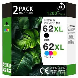 62XL High Yield Ink Cartridges Combo Pack (1 Black/1 Tri-Color 2-Pack) Compatible for HP 62XL 62 Replacement for HP Envy 5540 5640 5660 7644 OfficeJet 5740 5741 8040 200 250 Series Printers