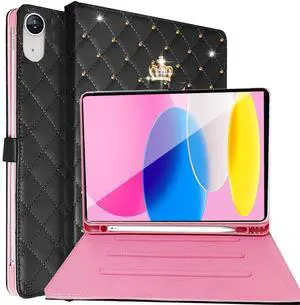 Changjia for iPad (A16) 11th Gen 11 Inch 2025/iPad 10th Generation 10.9" 2022 Case with Pencil Holder,Cute Crown Diamond Elegant PU Leather Auto Sleep/Wake Stand Protective Case for iPad 10/11th,Black
