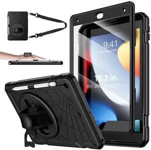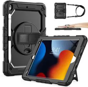 Sibeitu iPad 9th Generation Case 2021 10.2 Inch with Screen Protector & Kickstand, Protective iPad 7th 8th Gen Shockproof Case 2019 2020 Cover with Hand Shoulder Strap, Heavy Duty & Rugged, Black
