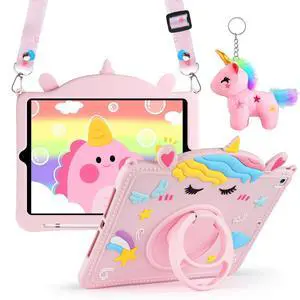 for iPad Pro 9.7 inch Case with Unicorn Key Chain Pencil Holder 360 Rotating Stand for iPad Air 1/2, 5/6th Gen/Pro Case for Kid Girls with Lanyard Shoulder Strap Silicone Protective Tablet Cover