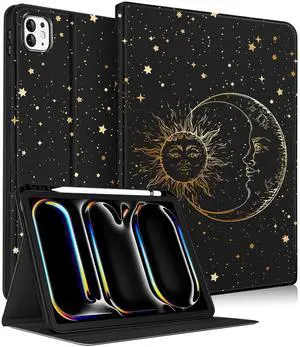 Uppuppy for iPad Pro 11 Inch Case 2024 - Women Girls Cute Folio Smart Cover with Pencil Holder Sun Moon Star Black Girly Pretty Unique for iPad Pro 11 M4 Cases A2836 A2837 A3006
