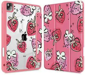 Tuiklol Case for iPad Pro 12.9 Inch M2 Case 2022 2021 2020 2018 Generation 6th/5th/4th/3rd,Built-in Pencil Holder Clear Transparent Protective Back Shell Cover, Strawberries