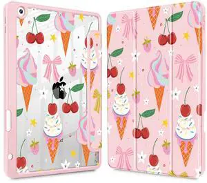 Lepeoac for iPad 9th Generation with Pencil Holder, iPad 8th/7th Gen Case 10.2-inch, [Built in Pencil Holder] Trifold Stand Auto Wake/Sleep Clear TPU Protection Back Cover, Ice Cream-Bows-Pink