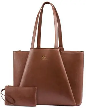 LOVEVOOK Laptop Tote for Women - 15.6 Inch Faux Leather Laptop Bag with Clutch, Large Capacity Office Purse Computer Briefcase for Casual Business Travel,Apricot
