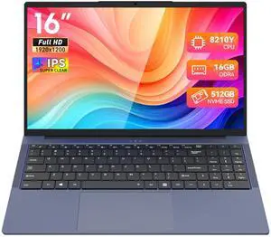 PSWIHWG 16 Inch Laptop i5-8210Y (Up to 3.6GHz), 16GB RAM, 512GB SSD, Win 11, Full HD Display, RJ45 Ethernet Port, Type-C, HDMI, WiFiBacklit Keyboard