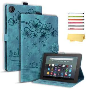 UUcovers for Kindle Fire HD 8 Tablet 8" Case (8th/7th/6th Generation, 2018/2017/2016) with Stand/Pencil Holder/Card Pockets/Embossed Flower Folio Magneic Wallet Cover, Cherry Blossom Green Cat