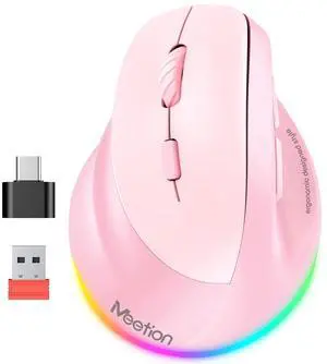 MEETION Left-Handed Mouse, Ergonomic Mouse Wireless Vertical Mouse, RGB Mice for Bluetooth(5.2 + 3.0) & USB-A with Type-c Adapter 4 Adjustable DPI for Mac/Windows/Tablet/iPad/PC Pink