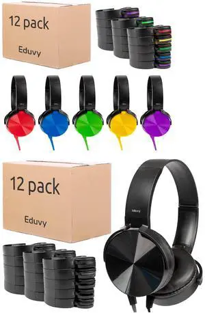 Eduvy 24 Pack Bundle, Bulk Headphones for Classroom, Pack of 12 Wired Mixed Color Headphones and Pack of 12 Black Color School Headphones for Elementary to College Students (48 Headphones Bundle)