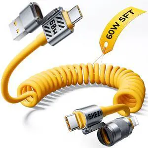 Jixivor Coiled Cable 4-in-1 USB C Cable 60W Compatible with Lightning Cable Fast Charging & Data Transfer, Support to CarPlay & Android Auto, 5FT Multi Cord Combo Charger for iPhone/iPad
