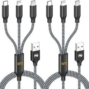 3 in 1 Multi Charging Cable 6ft 2 Pack Nylon Braided Charger Cord with Lightning USB C and Micro USB Connectors Universal Phone Charging Cable for iPhone and Android Devices