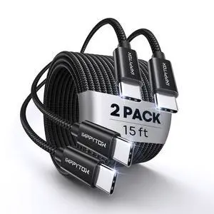 USB C to USB C Cable 15ft 2-Pack, 60W Fast Charging Long Type C Cable, Nylon Braided USB-C Charger Cord for iPhone 16/16 Pro/Max, 15 Pro Max, MacBook Pro, iPad Pro, Galaxy S24, Pixel 8 (PD Compatible)
