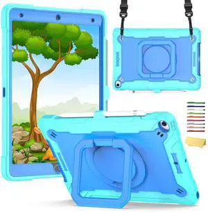UUcovers Case for iPad 9th/8th/7th Generation, iPad 10.2 Inch 2021/2020/2019 with 360deg Rotating Kickstand Hand/Shoulder Strap Heavy Duty Shockproof Swivel Ring Handle Stand Cover, Mint Green + Blue