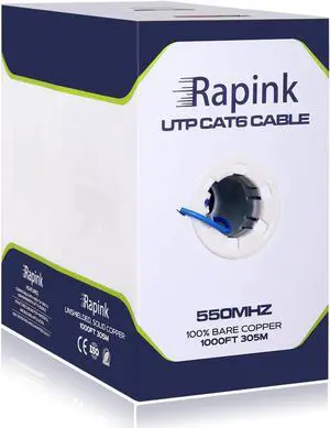 Rapink Cat6 Ethernet Cable 1000ft, Cat6 ethernet Cable 23AWG Solid Bare Copper 10G Support, UTP cat6 Cable 550MHZ, cat 6 Cable 1000ft POE Support Blue