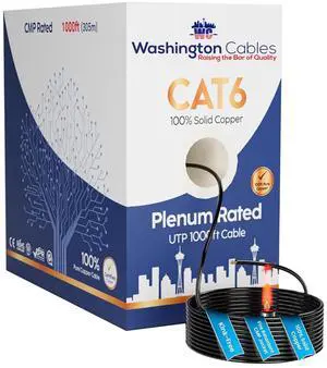 Washington Cables Cat6 Ethernet Cable 1000ft Plenum | 550MHz, 23AWG, 4Pair Cat 6 Plenum Cable 1000ft |100% Solid Bare Copper Conductor | Premium Cat 6 1000 ft Solid Copper Cable (Black)