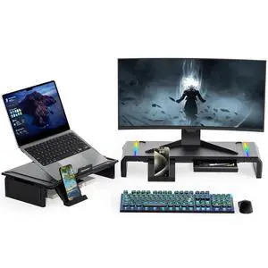 Heymaster Dual Monitor Stand for Desk, Gaming Monitor Riser with RGB Light, Foldable Computer Monitor Stand Riser, Desk Organizers and Accessories for Desktop, Printer (Black)