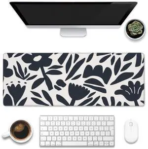 Eflxamz Desk Pad, Hand Drawn Leaves and Flowers Desk Mat, Abstract Plant Large Gaming Mouse Pad with Non-Slip Base and Stitched Edge, 31.5"x11.8"