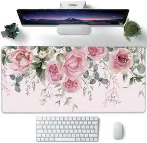 Mouse Pad, Large Pink Roses with Butterflies Desk Mat, Extended Non-Slip Gaming Keyboard Mousepad Desk Pad, Thick Stitched Edges Waterproof Mouse Mat 31.5"x15.7" (Beautiful Spring Floral)
