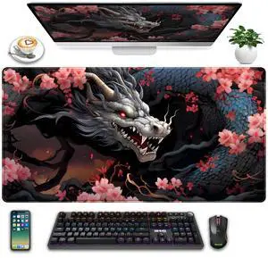 Cute Sakura Dragon Gaming Mouse Pad Kawaii XXL Large Extended Anime Desk Mat, Non-Slip Rubber Base Mousepad, Office Decor Desk Pad, Cool Keyboard and Mouse Mat with Stitched Edges, 31.5x15.75 in