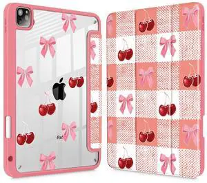 Lepeoac Case for iPad Pro 11 inch (4th, 3rd, 2nd & 1st Gen) 2022 2021 2020 2018, Buit in Pencil Holder with Shockproof Cover Clear Shell + Auto Wake/Sleep, Cherry Bow Checkered