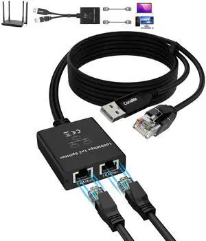 Gigabit Ethernet Splitter 1 to 2 Out Adapter, RJ45 Splitter with 6FT USB Power Cable and RJ45 Input Cable 3 in 1, Network Splitter 1 Male to 2 Female, 1K Mbps High Speed, Supports Cat5/5e/6/7/8 Cable