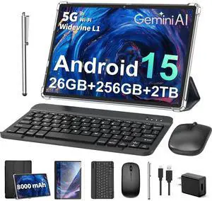 Android 15 Tablet with Keyboard, 26GB RAM, 256GB ROM(2TB Expand), 10 inch tablet with Octa-core, 8000mAh Battery, 2.4G/5G WiFi, BT 5.0, 5MP+13MP Camera, Gemini AI, Case, Mouse, Stylus (Green Case)