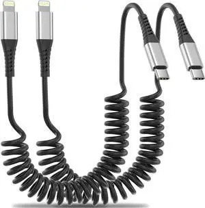 Coiled USB C to Lightning Cable for Car 2 Pack 3FT Apple Carplay Cable Short Retractable iPhone Charger Fast Charging Cord for iPhone 14 13 12 11 Pro Max Xs X Xr 8/Airpods
