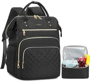 Lunch Backpack, 15.6 inch Laptop Backpack with Insulated Lunch Bag, Backpack Cooler for Women, Large Travel Backpack Lunch Box Compartment, Work Computer Backpack, Teacher College Book Bag, Black