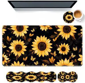 DHEEBFWE Keyboard Mouse Pad Set,Large Desk Pad+Keyboard Wrist Rest+Mouse Wrist Support+Coaster,Easy Typing Pain Relief Non-Slip Wrist Support Mousepad Set Home Office,Sunflowers and Butterflies