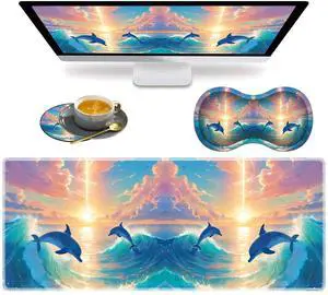 3 Piece Mouse Pad Set With Stitched Edge - Large Anti-Slip Desk Pad, Keyboard Pad, Wrist Rest, and Coaster - Memory Foam for Office/Home - Moonlight Dolphin