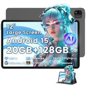 Azeyou 12 Inch Android 15 Tablet with Case, 20GB RAM 128GB ROM AI Tablet, A733 Octa-Core Processor, 2000x1200 2K Display, 8000mAh, 5MP+13MP Dual Cams, WiFi6, BT5.0, Widevine L1, Type-C 20W PD Charger
