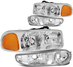 DNA Motoring HL-OH-DAN994P-CH-AM For 2001 to 2007 GMC Sierra C3 Yukon Denali 4Pcs of Chrome Housing Amber Corner Headlights + Bumper Lamps 02 03 04 05 06 Left + Right