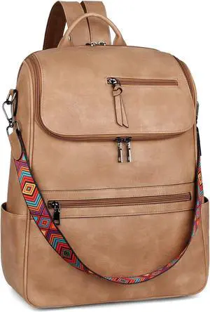 FADEON Laptop Backpack for Women Leather Travel Backpack with Laptop Compartment, Designer Ladies Computer Backpacks Camel