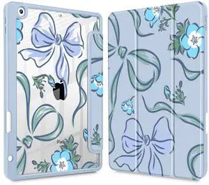 Mektron Printed Case for iPad 10.2 Inch 2021/2020/2019, for iPad 9th/8th/7th Gen Case, Buit in Pencil Holder with Shockproof Cover Clear Shell + Trifold Stand + Auto Wake/Sleep,Flowers-Bows-Blue
