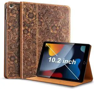 Gexmil Leather Case for iPad 10.2 Inch, iPad 9th/8th/7th Gen,Cowhide Folio Cover for iPad 2021/2020/2019, Genuine Leather case, Auto Wake/Sleep,Adjustable Stand,Floral Brown