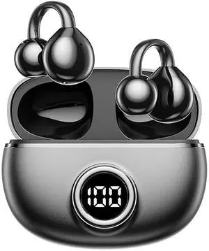 ABCDONG Wireless Earbuds Open Ear Clip On Headphones with LED Digital Display Charging Case Touch Control Bluetooth 5.4 Air Conduction Sport Earphones for Running Fitness, Dark Grey