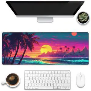 Eflxamz Desk Mat, Science Fiction Beach Sunset Desk Pad, Neon Design Beach Large Gaming Mouse Pad with Non-Slip Base and Stitched Edge, 31.5"x11.8"