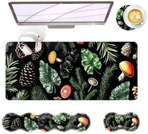 BFUKVOU Large Keyboard Mouse Pad Set, Extended Mouse Pad+Keyboard Wrist Rest Support, Memory Foam Ergonomic Easy Typing, 4Pcs (31.5×11.8 in) Desk Pad Set for Office Home,Mushrooms and Leaves
