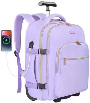 DEVPNR Rolling Backpack for Women, 17Inch Laptop Travel Backpack with Wheels, Carry on Luggage Airplane, Overnight Business Bag (Taro Purple) (In Patent)