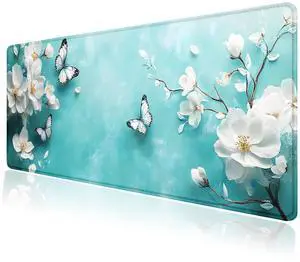 Aqua White Flowers Butterfly Large Mouse Pad, Desk Mat Computer Keyboard Pad Non-Slip Rubber Base Waterproof with Stitched Edges for Laptop Gaming, Office & Home 31.5 x 11.8 Inch (XL-22)