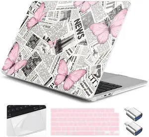 Yebiseven for MacBook Air 13(13.6) inch Case 2025 2024-2022 M4 M3 M2 A3240 A3113 A2681 Shockproof & Scratch-Resistant Hard Shell + Keyboard Cover + Trackpad Protector + Type C, Newspaper Butterfly