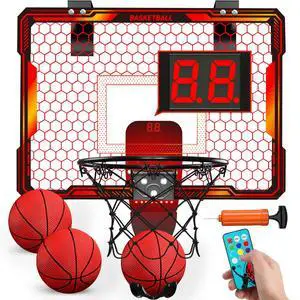 Remote Control Basketball Hoop Indoor with 7 LED Lighting, Mini Basketball Hoop with Electronic Scoreboard, 3 Modes, Over Door Basketball Hoop, Basketball Toys Sport Gifts for Kids, Adults (red)