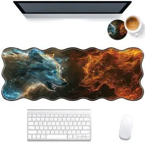 DHEEBFWE Large Gaming Mouse Pad for Desk, 31.5x11.8in, Irregular Wavy Stitched Edges, XL Mousepad with Anti-Skid Rubber Base, Keyboard and Mouse Mat, Office Desk Writing Pad,Fire with Ice Wolf
