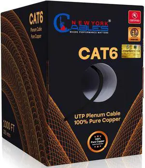 NewYork Cables | CAT6 Plenum Cable 1000ft UL & ETL Listed, 100% Pure Bare Copper, UTP, 550MHz, 23AWG, 4Pair 10GB Ethernet Cable | Certified CMP-Rated Fire-Resistant (1000ft, Pure Copper UL/ETL, Black)