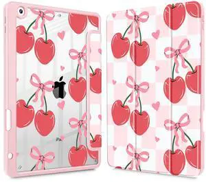 Mektron Printed Case for iPad 10.2 Inch 2021/2020/2019, for iPad 9th/8th/7th Generation Case, Buit in Pencil Holder with Shockproof Cover Clear Shell + Trifold Stand, Cherries Bows C353