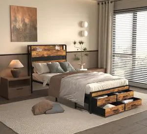 Full size metal bed frame, square platform bed with under-bed storage, no spring-loaded mattress required, vintage brown