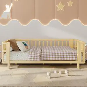 Twin Size Bed Floor Bed with Safety Guardrails and Door for Kids, Natural(Old SKU: W1580P154623)