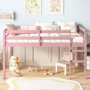 Solid Wooden, Rubber Wooden Twin Loft Bed with Ladder, Bed Platform of Strengthened Slats, Pink
