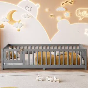 Twin Size Bed Floor Bed with Safety Guardrails and Door for Kids, Gray(Old SKU: W1580P154621)