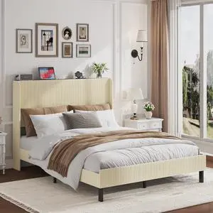Queen Size Platform Bed , Metal Bed Frame with Charging Station, No Box Spring Needed, (Beige), Noise Free,Easy Assemble.