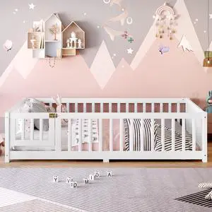 Full Floor bed with Heightened Fence and bookshelf ,Wood Floor Bed for Kids,Natural.